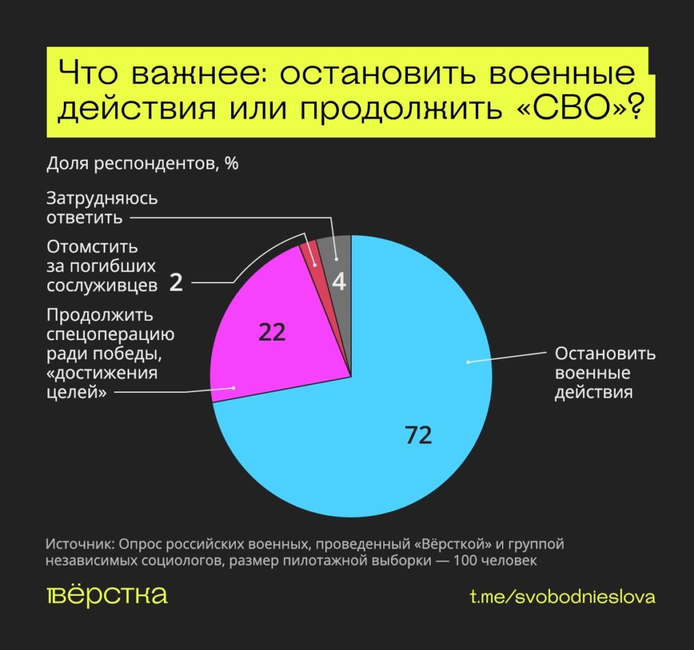 При цьому автори зазначають, що бажання зупинити війну серед окупантів зменшується залежно від тривалості знаходження на фронті. Про припинення вогню мріють лише 57% тих, хто на фронті понад два роки. Серед новобранців таких 77%.