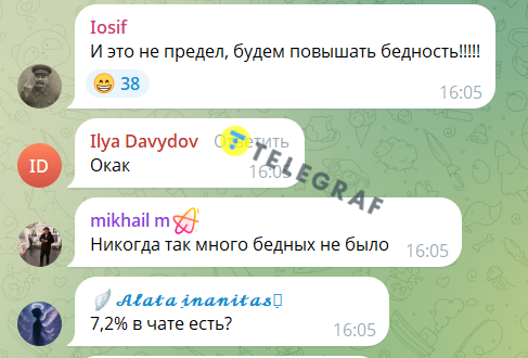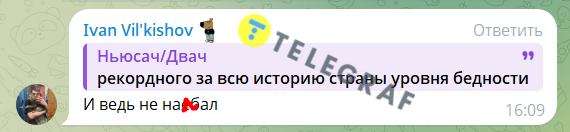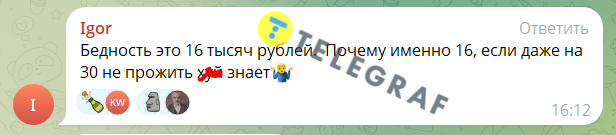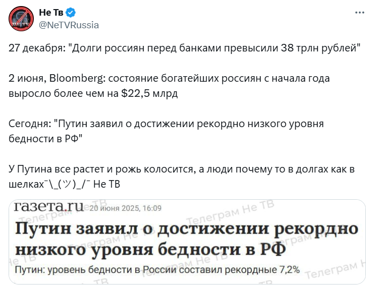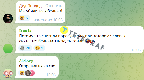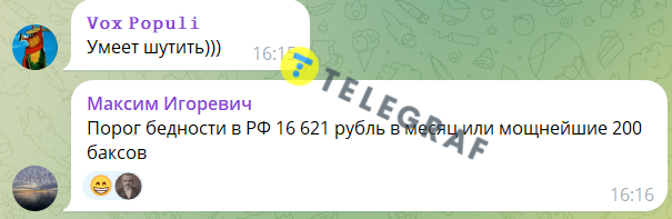 Громадяни РФ також зазначили, що це тому, що бідними в країні вважаються люди з доходами до 16621 руб., у той час, як і на вдвічі більшу суму прожити важко. Один із підписників написав, що це підсумки 25-річного правління Путіна.