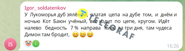 "Телеграф" зібрав найцікавіші коментарі росіян у соцмережах із цього приводу. Путіна порівняли з котом Баюном, який розповідає казки про сім відсотків бідних та Київ за 3 дні.