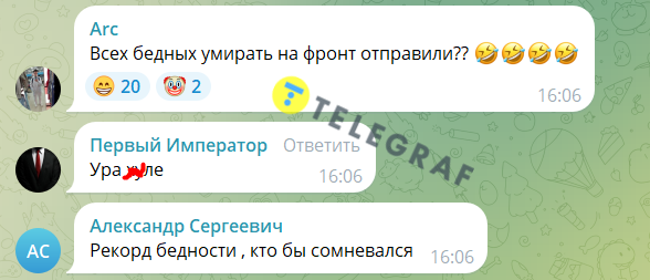Більшість інтернет-користувачів вважають, що найменш забезпечені росіяни повелися на великі виплати та пішли воювати з Україною за контрактом. Хтось так і написав: "Ми вбили бідних". Інший підписник припустив, що якщо Росгвардію перепрофілювати на розстрільні групи, то рівень бідності ще впаде.