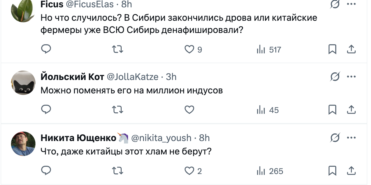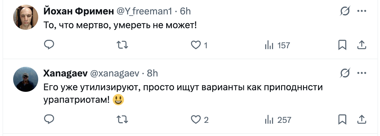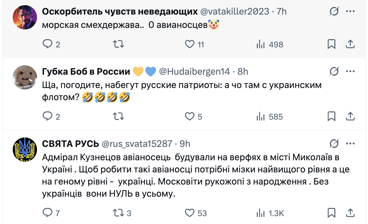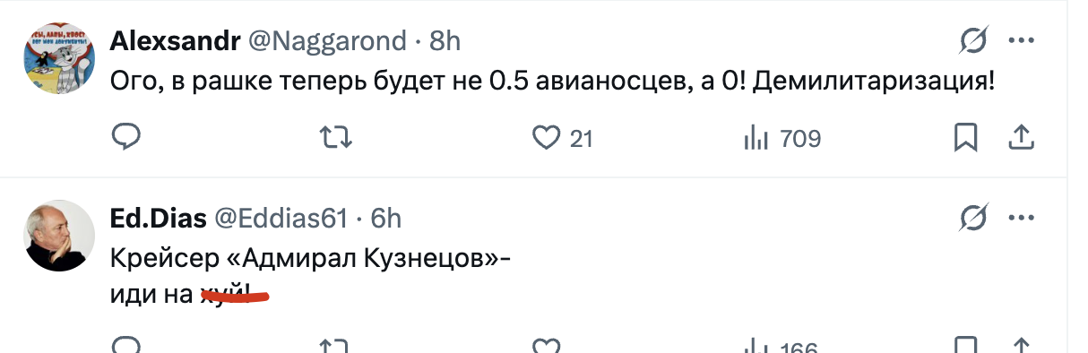 У мережі користувачі не здивовані таким рішенням, адже не бачать доцільності використання авіаносця. Чимало людей зазначають, що в сучасних реаліях "Адмірал Кузнєцов" буде досить легкою ціллю для українських дроні та ракет. До того ж виробник цього авіаносця Україна, і дехто вважає, що у росіян "мізків не вистачає відремонтувати" судно.