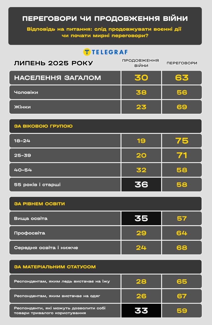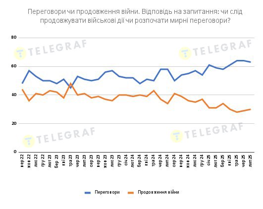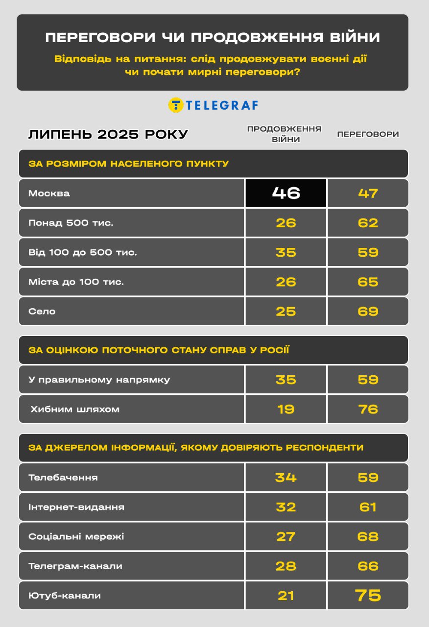 Опитування "Левада-центру" у липні 2025 року показало, що більшість росіян (63%) виступають за припинення війни з Україною шляхом переговорів, у той час як 30% підтримують продовження бойових дій.