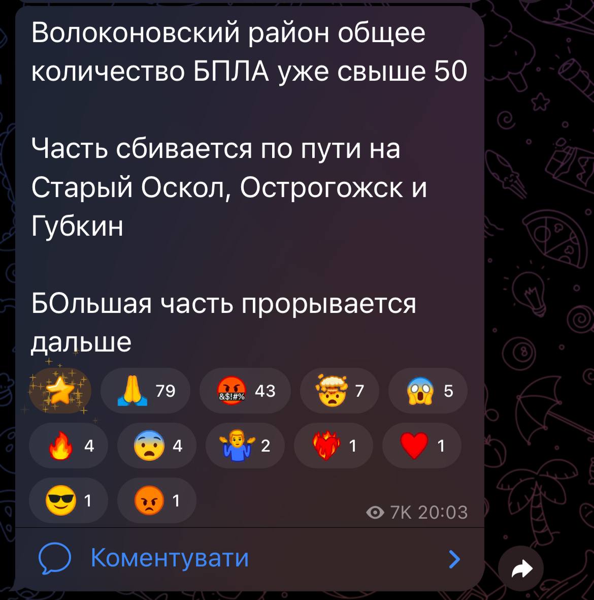Російські пабліки пишуть, що нібито ППО "успішно" збиває дрони над Старим Осколом, Острогожським та Губкіним. Однак чимало дронів все ж проривають оборону та прямують у глиб області.