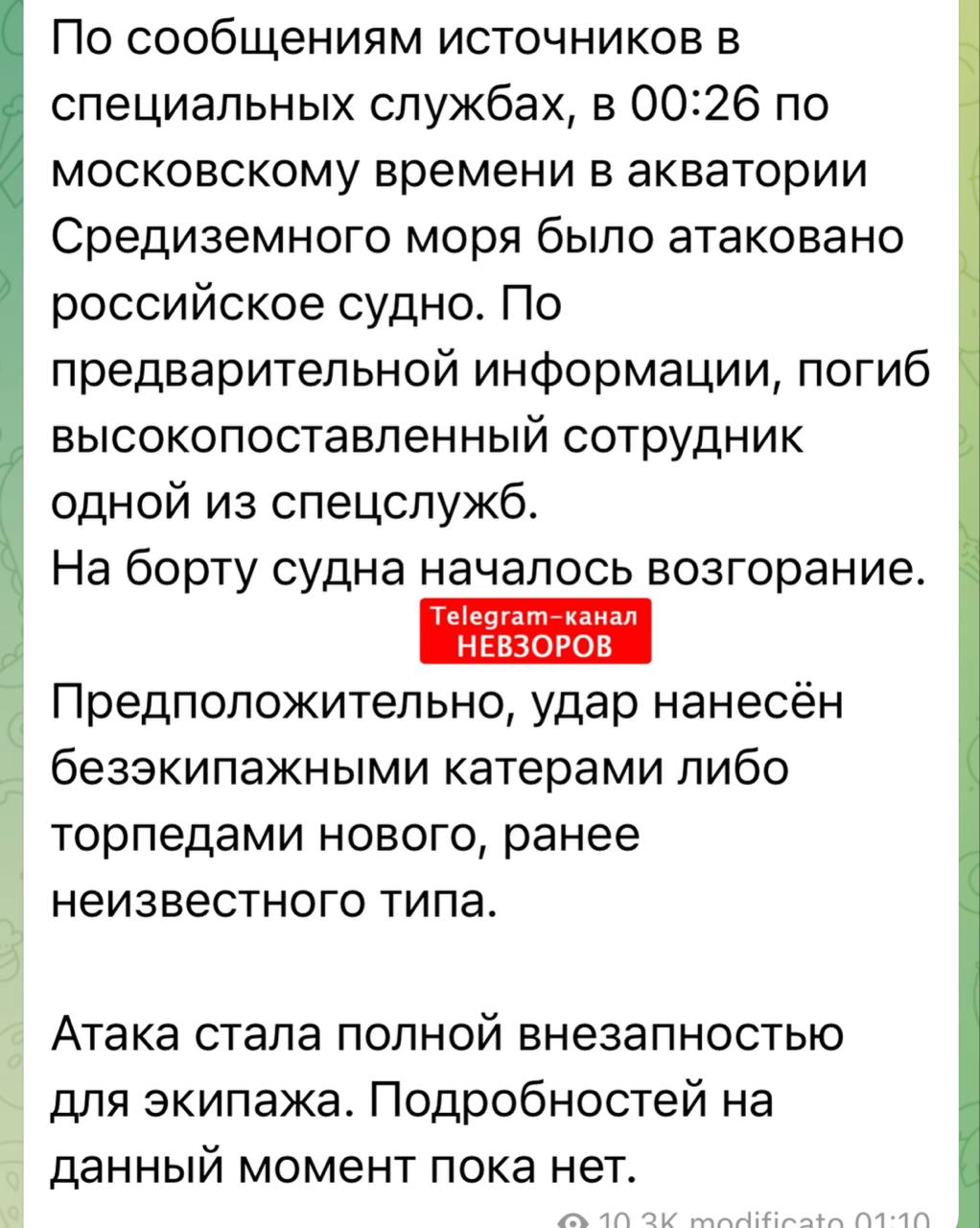 Російські джерела стверджують, нібито "за повідомленнями джерел у спеціальних службах", російське судно було атаковане невдовзі після опівночі 19 грудня в акваторії Середземного моря. За попередньою інформацією, йдеться у повідомленні, загинув високопоставлений співробітник однієї зі спецслужб.