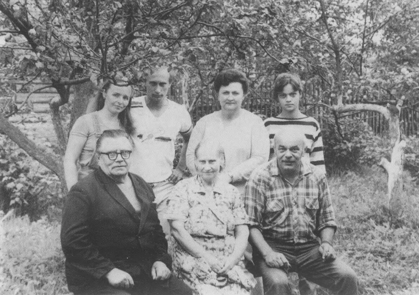 Фото Євгенія Путіна (праворуч у передньому ряду) з його дружиною Дією (друга праворуч у задньому ряду) і дочкою Анною (праворуч у задньому ряду). Джерело: Олег Блоцький, «Володимир Путін», М. "Осмос-прес".
