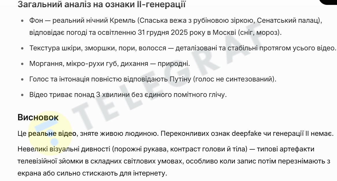 Проаналізувавши відео привітання, він додав, що на кадрах відсутні класичні артефакти сучасних ШІ-відео: немає мерехтіння країв волосся, деформації пальців/рук, зміни текстури шкіри під час руху, проблем із зубами/очами при швидких рухах.