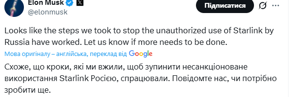 "Схоже, що кроки, які ми зробили, щоб зупинити несанкціоноване використання Starlink Росією, спрацювали. Повідомте, чи потрібно зробити щось ще".