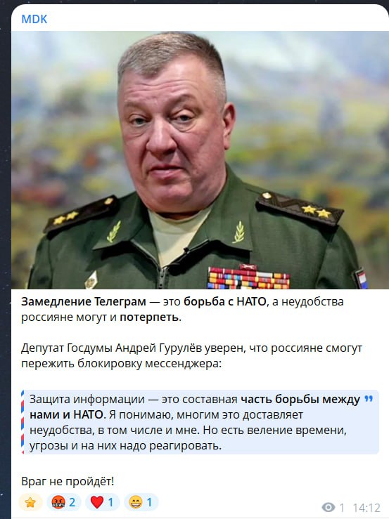 Депутат Держдуми Андрій Гурулєв, коментуючи обмеження роботи Telegram, заявив, що "захист інформації – це складова частина боротьби між РФ і НАТО".