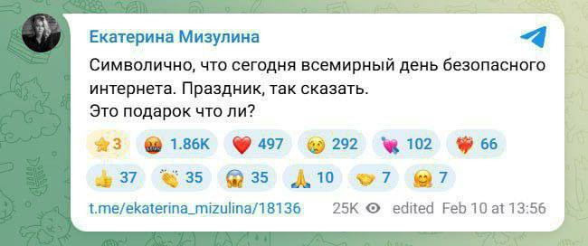 Висловилася з цього приводу також голова Ліги безпечного інтернету Катерина Мізуліна: "Символічно, що сьогодні Всесвітній день безпечного інтернету. Свято, так би мовити. Це подарунок чи що?".