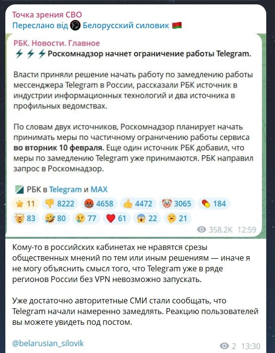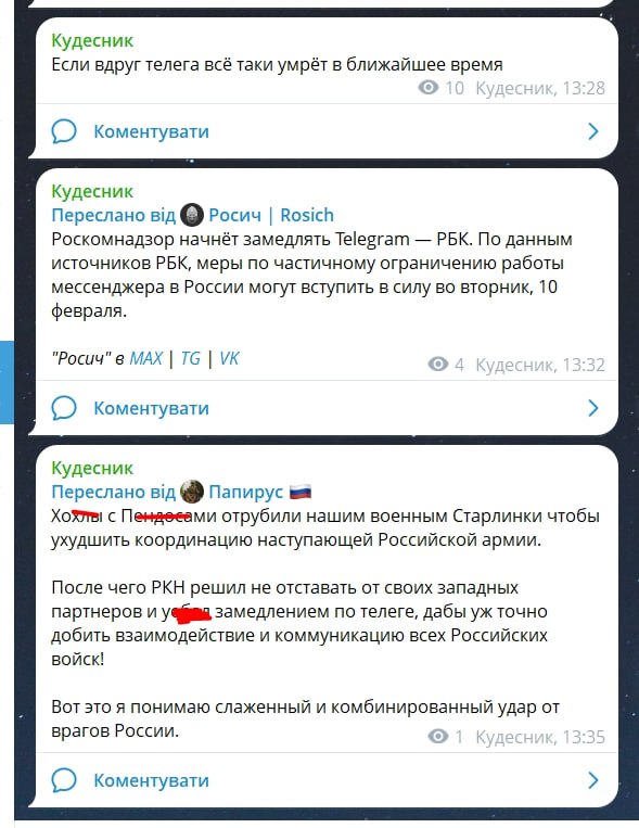 "Особлива гнусність уповільнення роботи Телеграма висловлюється в тому, що через телегу йде комунікація на фронті…"
