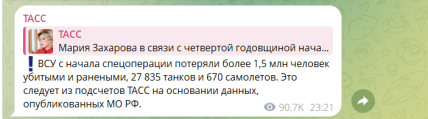 Представниця МЗС Росії Марія Захарова у виступі до четвертих роковин війни, яку її країна веде проти України, заявила, що ЗСУ з початку повномасштабного вторгнення нібито "втратили понад 1,5 млн осіб убитими та пораненими". Однак кілька місяців тому радник глави РФ Володимира Путіна Антон Кобяков називав більшу цифру.
