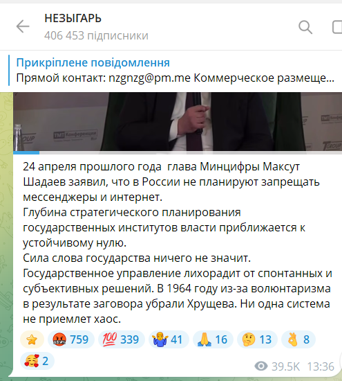 У ньому йдеться, що торік голова російського Мінцифри заявив, що у РФ не планують забороняти месенджери та інтернет. "Глибина стратегічного планування державних інститутів влади наближається до стійкого нуля. Слово держави нічого не важить. Державне управління страждає від спонтанних і суб’єктивних рішень", — пишуть в каналі. Останні речення — про те, що саме через волюнтаризм у результаті змови усунули Хрущова, а також, що "жодна система не терпить хаосу".