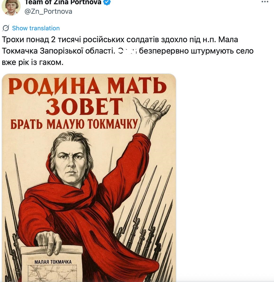 "Трохи понад 2 тисячі російських солдатів здохло під н.п. Мала Токмачка Запорізької області. Орки безперервно штурмують село вже рік із гаком", — йдеться в повідомленні.