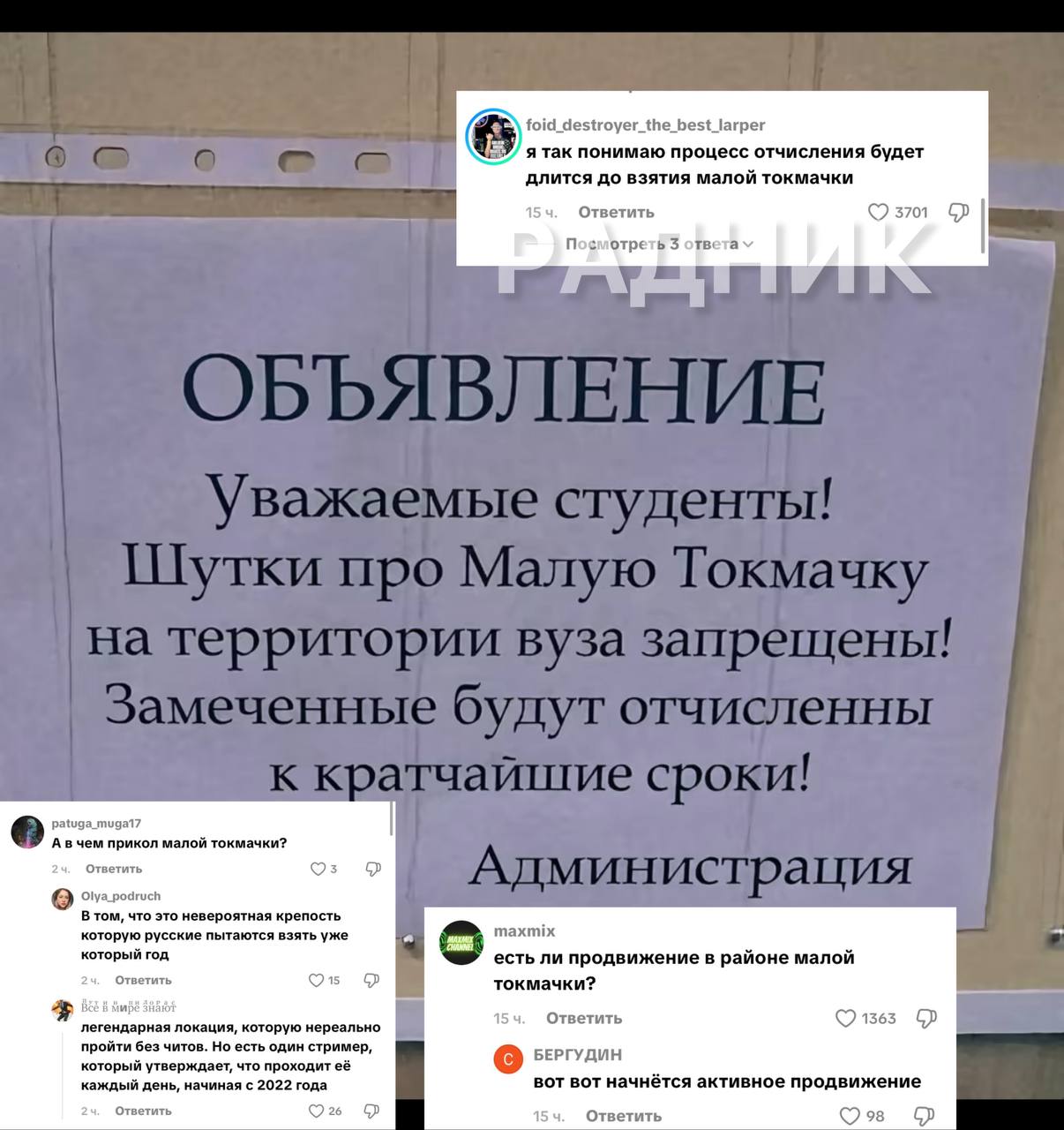 Історія з наступом армії РФ на Малу Токмачку Запорізької області стала дуже популярною серед російської молоді. Дійшло до того, що в деяких вишах погрожують відрахуванням за жарти на цю тему, а соцмережі переповнені мемами.