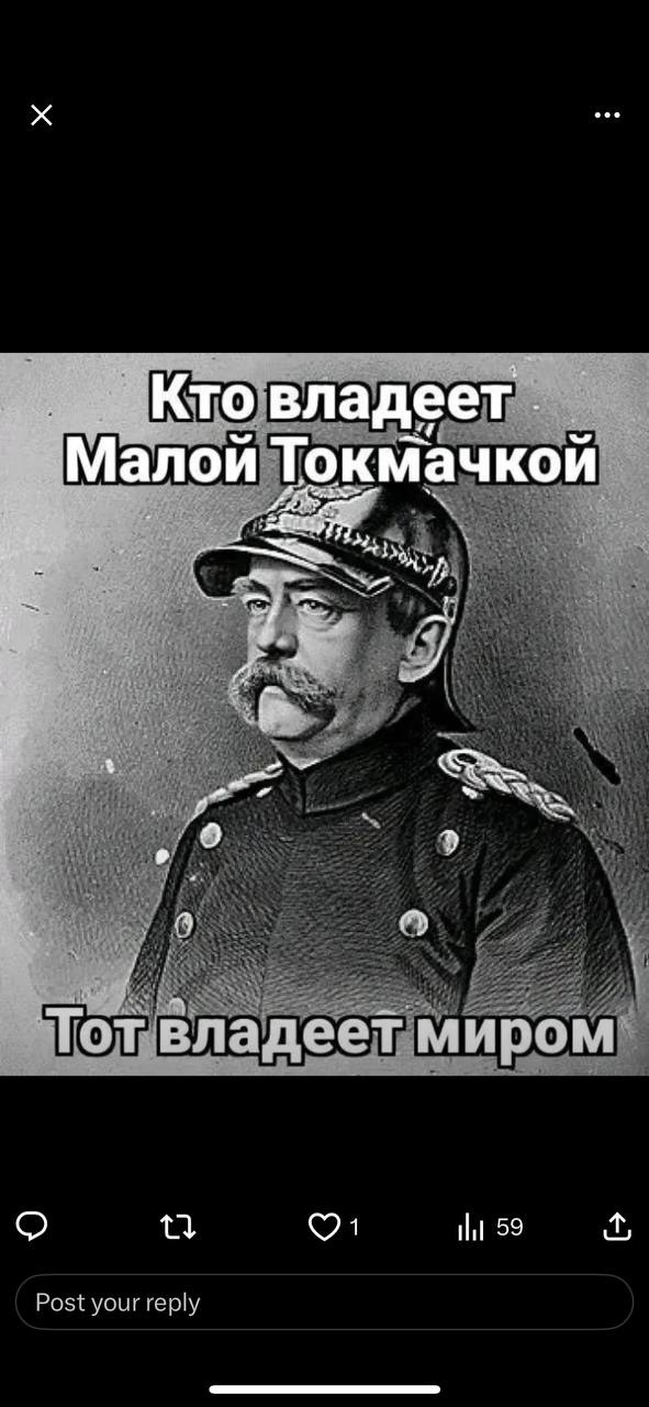На наступній картинці зображено першого райхсканцлера Німецької імперії Отто фон Бісмарка. З цитатою: "Хто володіє Малою Токмачкою, той володіє світом".