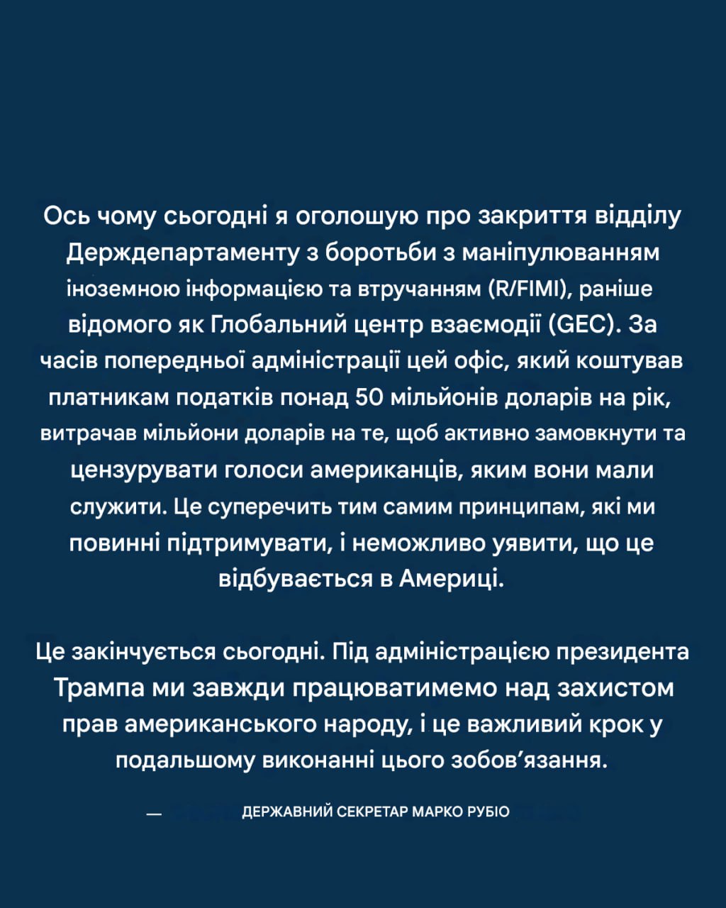 Рубіо, оголошуючи про закриття Відділу Держдепу щодо боротьби з іноземним інформаційним втручанням (R/FIMI) – раніше відомого як Глобальний центр взаємодії (GEC), заявив, що відділ обходився в понад 50 мільйонів доларів на рік