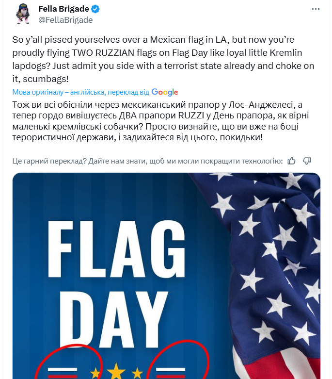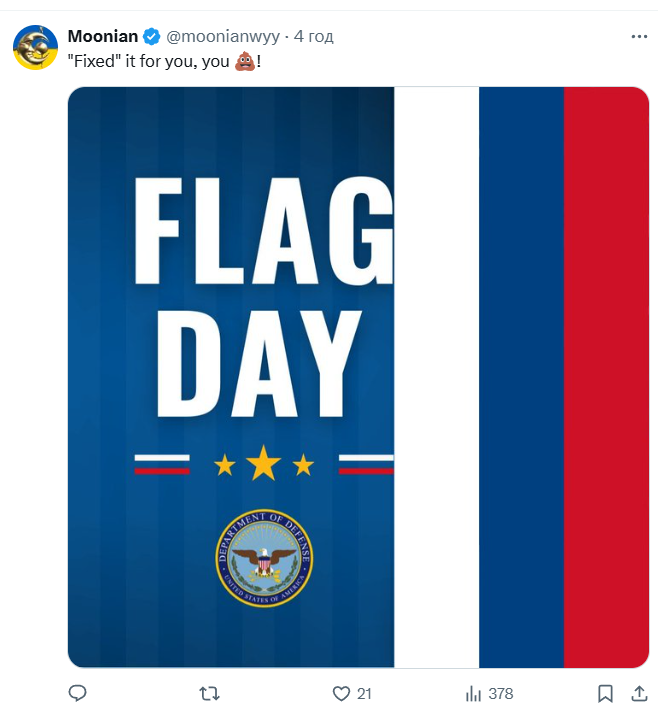 У День прапора в США Пентагон опублікував привітання, але на зображенні помітили елементи, схожі на російський триколор. У мережі почалася хвиля обурень із цього приводу.