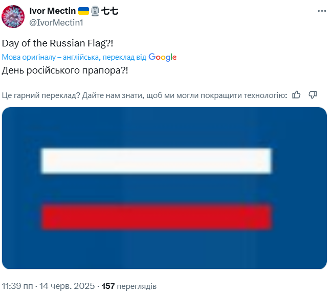 До речі, дехто пояснює, що на фото не російські прапори. Синій колір — це тло, на якому зображені білі та червоні смужки, що в цілому створює видимість символіки РФ.
