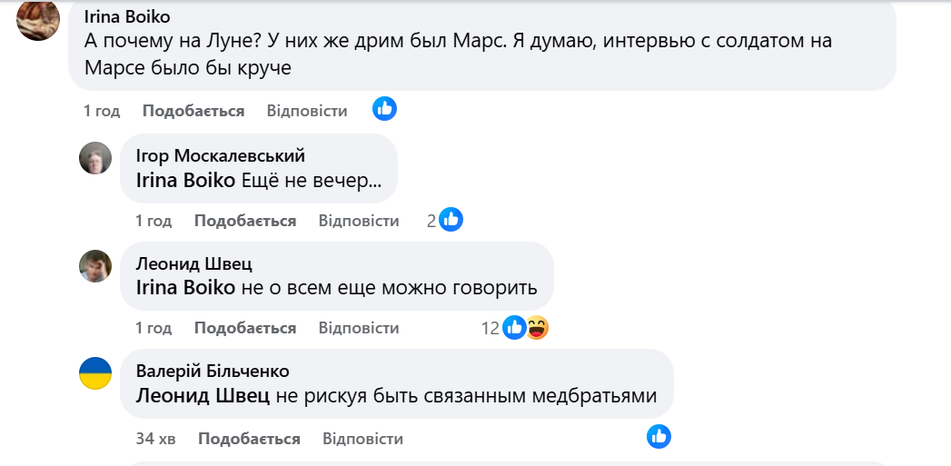 "А чому на Місяці? У них дрім був Марс. Я думаю, інтерв'ю з солдатом на Марсі було б крутіше", "Не про все ще можна говорити", "…не ризикуючи бути зв'язаним медбратами", "Їх там усіх з одного дурдому випустили", "Як багато нового ми дізнаємось про Штати останніми місяцями",- пишуть коментатори.