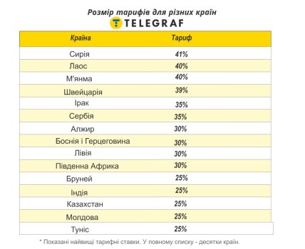Для Євросоюзу встановили 15-відсоткові тарифи. Молдова отримала 25-відсоткове митне навантаження. Найвищі тарифи — 39% — запровадили для Швейцарії. Сербія також потрапила під 35-відсоткові мита.