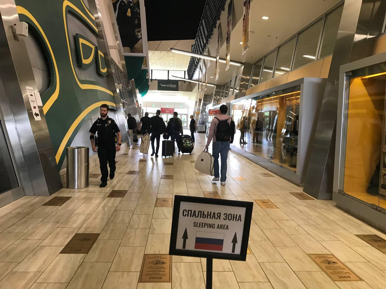 Як повідомляють росЗМІ, російських журналістів поселили на Alaska Airlines Center (домашня арена команди Seawolves). Там поставили розкладачки та ширми, є "кімнати" на одного, є на двох.