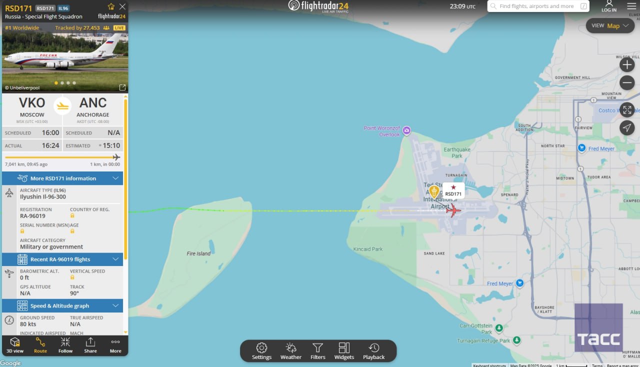 Літак із журналістами кремлівського пулу приземлився в Анкориджі о 02:10 15 серпня. Про це свідчать дані сервісу Flightradar, станом на 02:10 літак сів в аеропорту Анкоріджа на Алясці. Пропагандистка Маргарита Симоньян заявила, що в літаку їх годували котлетами по-київськи.