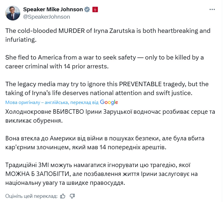 Зокрема, на вбивство відреагував спікер Палати представників Конгресу США Майк Джонсон. Він зазначив, що цей злочин "одночасно розбиває серце та викликає обурення".