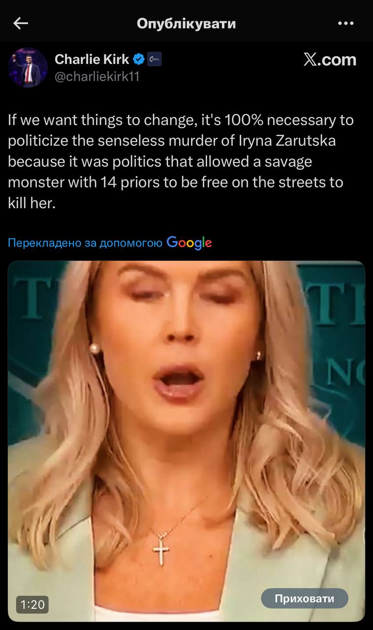 Чарлі Кірк на сторінці відреагував на вбивство української біженки Ірини Заруцької.