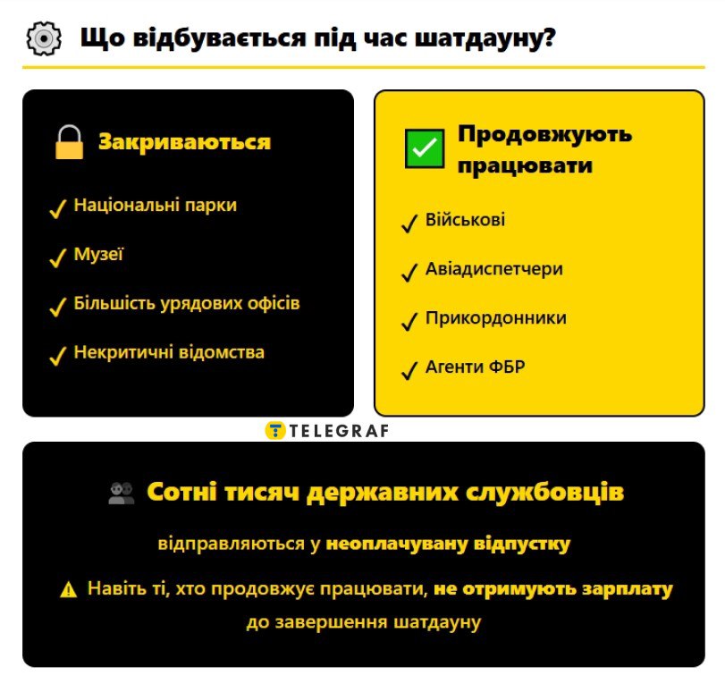 "Телеграф" розповідає, чому США знову опинились у бюджетній кризі, як глава Білого дому Дональд Трамп може використати цю ситуацію у своїх інтересах та чи вплине шатдаун на допомогу Україні.