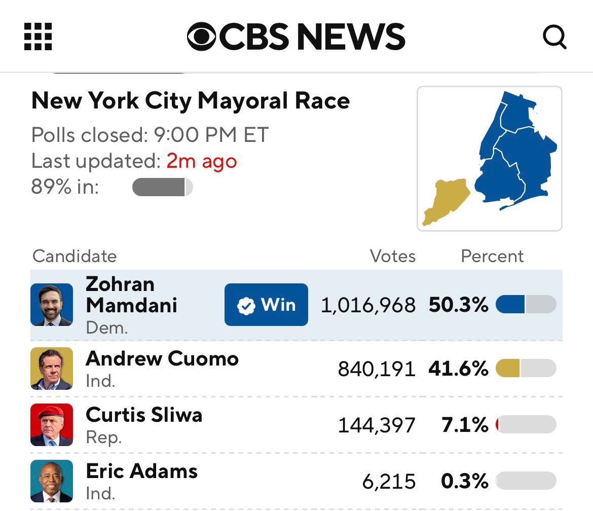 Підрахунок голосів ще триває, проте відомо, що Мамдані отримав 50,3% голосів виборців. Він впевнено випереджає свого суперника, колишнього губернатора штату Ендрю Куомо. Мамдамі згадав американського президента у своїй промові після оголошення результатів виборів.
