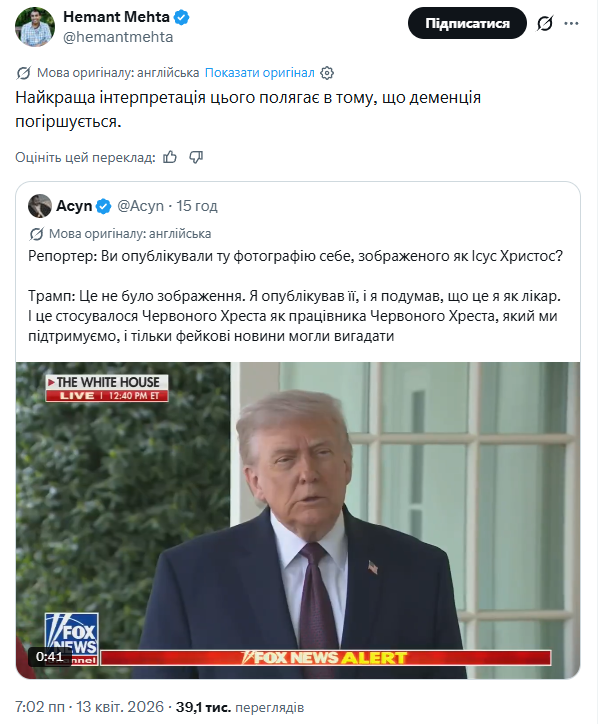"Найкраща інтерпретація цього полягає в тому, що деменція прогресує", — пише Мехт, а користувачі додають: "Так, божевільний самозванець, що зображає з себе доктора Ісуса".