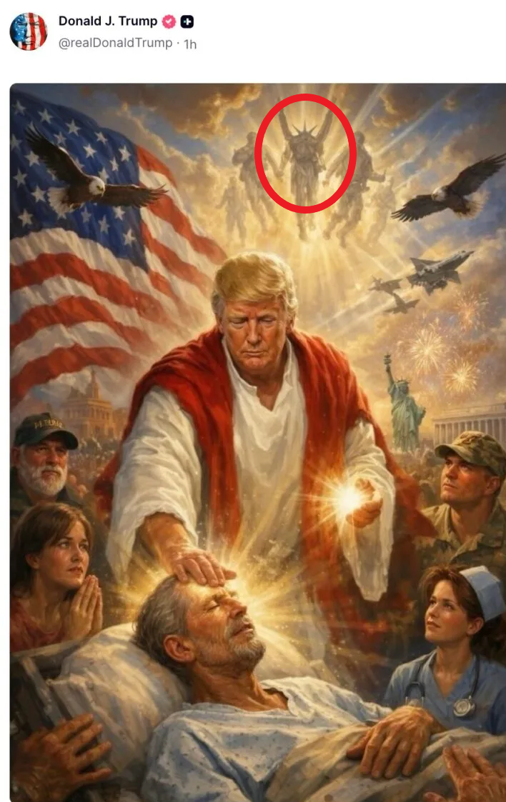 На знімку Трамп зображений з рукою на голові хворої людини. На фотографії його оточують послідовники, американський прапор, орли та Статуя Свободи.