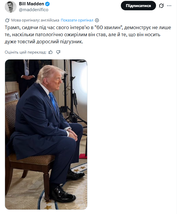 "Те, як Трамп сидить під час інтерв’ю програмі "60 хвилин", показує не тільки те, наскільки він страждає на ожиріння, але й те, що на ньому одягнений дуже товстий підгузок для дорослих".
