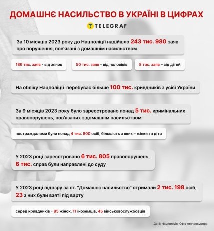 Згідно з даними департаменту превентивної діяльності Нацполіції України, наданими "Телеграфу", за 10 місяців 2023 року до Нацполіції надійшло 243 тисячі 980 заяв про порушення, пов'язані з домашнім насильством, в порівнянні з 2022 роком це на 20% більше.