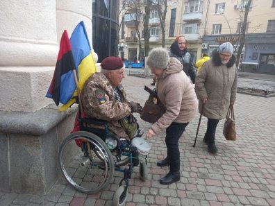 76-річний дядя Гриша — як нова копійка — цього тижня працює під ЦУМом у Полтаві. Змінив, як і всі українські десантники, блакитний берет на маруновий. Викинув вицвілий від років старий бушлат і вдягнув свіженький, подарований військовими. Ззаду на його кріслі колісному майорять незмінні синьо-жовтий і червоно-чорний прапори – подарунок запорізьких волонтерів. А спереду прикріплена "банка" для збирання коштів — прозоре пластикове відерце літрів на п’ять з прорізом на кришці.
