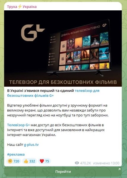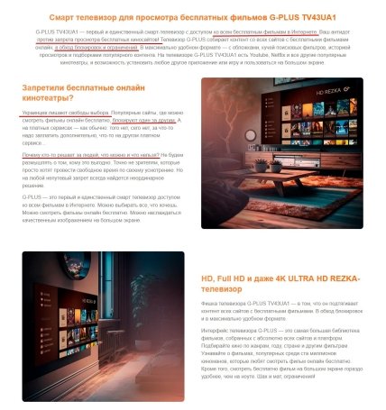 Йдеться про телевізор G-Plus TV43UA1, який описують як "єдиний смарт-телевізор з доступом до всіх безплатних фільмів в Інтернеті" та "антидот проти заборони перегляду безплатних кіносайтів". В описі телевізора прямо сказано, що він збирає всі можливі безплатні фільми в Інтернеті в обхід блокувань та обмежень. Також продавці заявляють, що "українців позбавляють права вибору".
