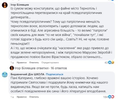 — За вчорашній день ми отримали дуже багато відгуків, слів підтримки. Ми зараз з вами розмовляємо, один за одним надходять повідомлення в приват від незнайомих людей, які хочуть подарувати Святославу книжки, — говорить Катерина. — З нами зв'язались також кілька видавництв, які так само висловили бажання передати сину книжки.