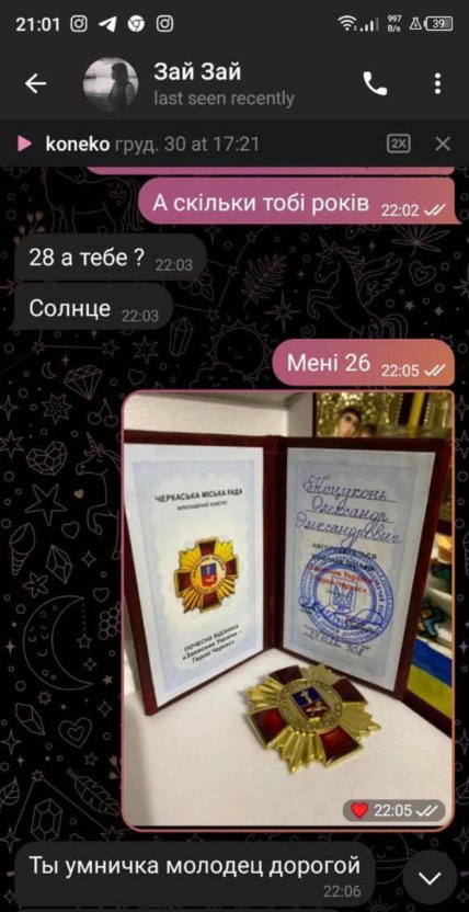 Цей школяр ще з зими почав спілкуватися з дівчатами в соцмережах і одному з месенджерів, писав їм, що йому 26, що він військовий, азовець, і хвалився нагородою, яку нібито отримав. А надсилав фото почесної відзнаки "Захисник України – Герой Черкас" разом з "орденською" книжкою з прізвищем мого сина. Також підліток жалівся співрозмовницям на певні складні обставини, нібито грошей навіть на цигарки в нього не було, тобто давив на жалість. Можливо, що певні кошти йому після цього і скидали, але не думаю, що йдеться про якісь значні суми.