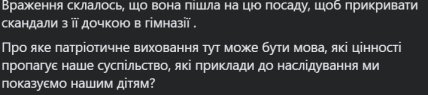 За словами коментаторів, які представляються батьками учнів навчального закладу, Радкевич отримала посаду голови наглядової ради, щоб прикрити скандал із її дочкою, яка навчається у гімназії.