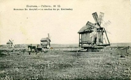 Також на світлинах можна побачити дерев'яні млини, що височіли над полями. Їхні крила оберталися завдяки силі вітру, перетворюючи зерно на борошно. Ці млини належали заможній родині Кочубеїв.