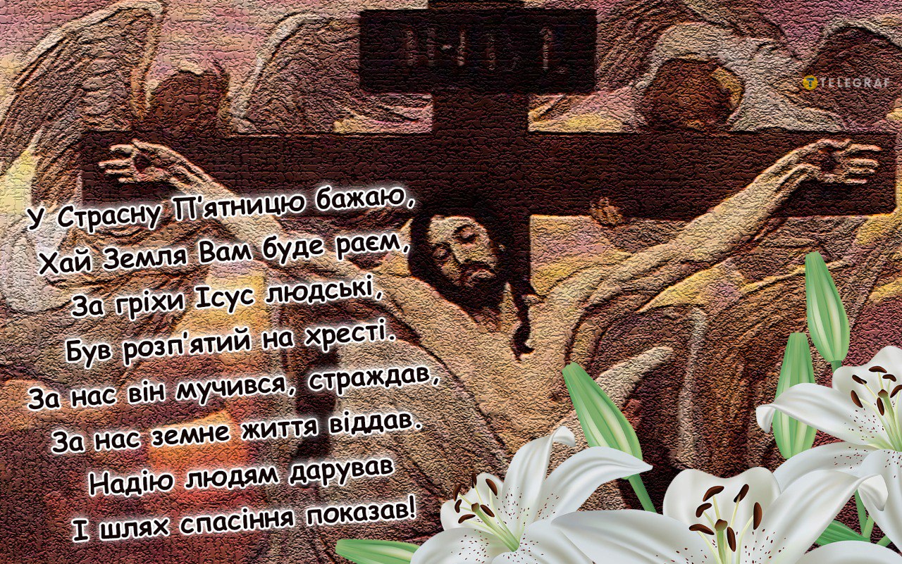 У Страсну п’ятницю бажаю стати міцнішим вірою, добрими душею, більш чуйні серцем. Нехай кругом буде мир і благодать, за які Ісус без краплі жалю віддав своє життя, нехай кожен день приносить радість, щастя і кохання, хай кожен вечір дає можливість щиро покаятися і відкрито помолитися.