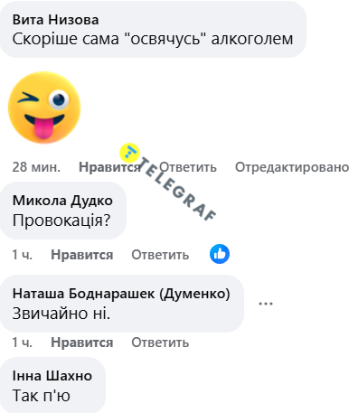 Інша написала: "Люди, ви серйозно?" Вона також поцікавилася, чи чорт долетить до неба, якщо йому пришити крила. Так вона алегорично пояснила, чому не варто брати до храму алкоголь.