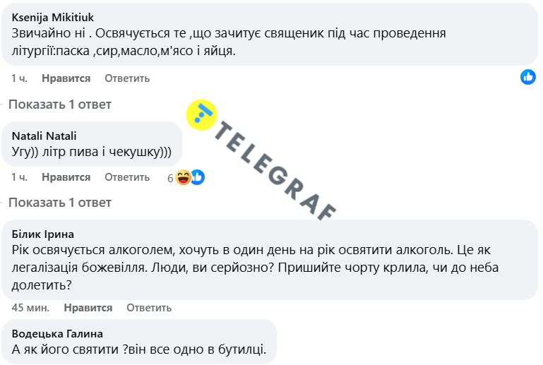 Підписниця відповіла, що, звичайно, ні. Вона нагадала, що освячується те, що зачитує священник при здійсненні літургії: паска, сир, олія, м’ясо та яйця.