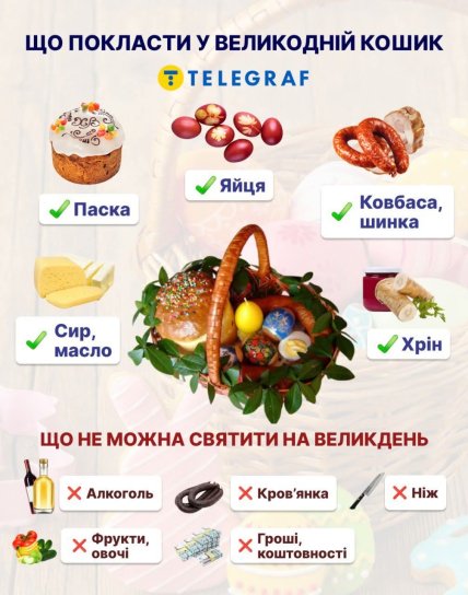 Існує цілий набір продуктів, які мають бути у великодньому кошику. У список входять: паска та фарбовані яйця, ковбаса, буженина, шинка, сир, сметана, олія, сіль та хрін. Серед ковбас існує виняток – не можна приносити до храму кров’янку.