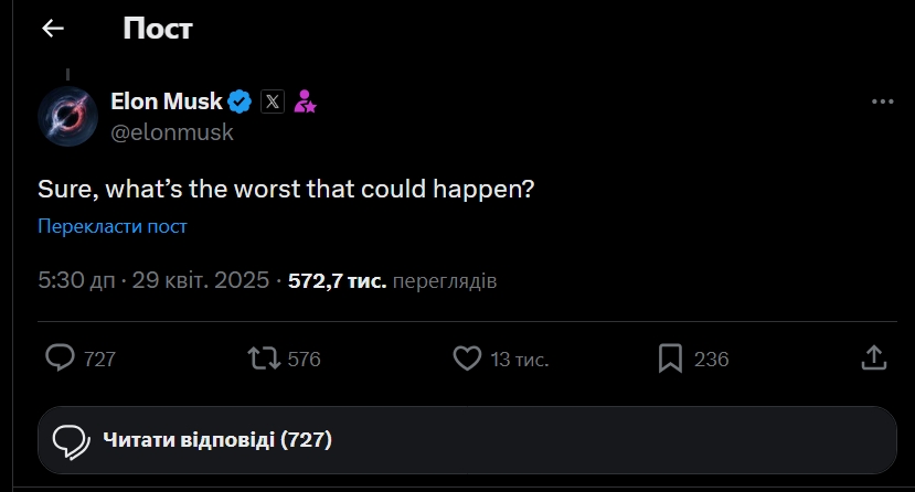 До обговорення приєдналися і знаменитості. YouTube-зірка MrBeast пожартував про проведення такого експерименту. А власник X Ілон Маск відповів: "Звичайно, що може піти не так?"
