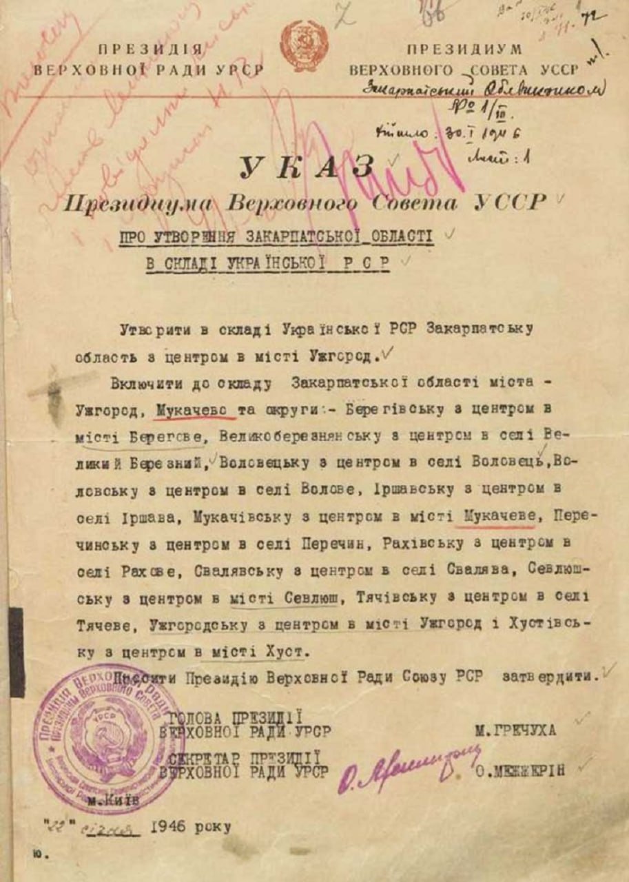 У кремлівського режиму на хвилі перемоги у війні лише збільшувався апетит. Сталіну вдалося "викрутити руки" Празькому Граду після кількох раундів секретних переговорів. 29 червня 1945 року в Москві було підписано Радянсько-чехословацьку угоду про приєднання Закарпаття до Української РСР. Ще деякий час питання зависло у повітрі. Причина була в тому, що майже всі закарпатці, навіть місцеві комуністи, виступали за повернення до складу ще на той час демократичної Чехословаччини. Офіційно цей невеликий регіон став обласним центром УРСР зі столицею в Ужгороді лише 22 січня 1946 року. Чинність законодавства радянської України на території Закарпатської області було поширено ще через день окремим указом Президії Верховної Ради.