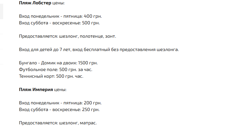 Вартість вхідного квитка залежить від дня тижня та вибраних послуг. Наприклад, щоб відпочити на пляжі "Лобстер", доведеться заплатити 400 грн (ціна за вхід з понеділка по п’ятницю) та 500 гривень (вхід у суботу та неділю). Також можна орендувати бунгало, футбольне поле та тенісний корт.