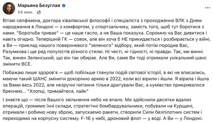 "Вітаю селфімена, доктора ківалівської філософії і спеціаліста з проходження ВЛК з Днем народження в Лондоні — з комфортом, у спортзальчику, замість того, щоб тут боротися з нами. "Боротьба триває" — це наше гасло, а не Ваша показуха. Соромно на Вас дивитися і навіть огидно", — написала Безугла.