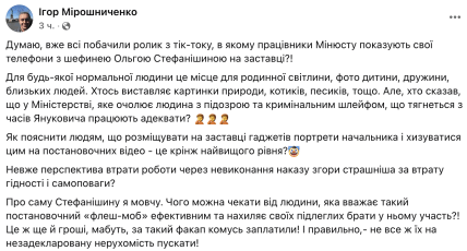 "Хто сказав, що у Міністерстві, яке очолює людина з підозрою та кримінальним шлейфом, що тягнеться з часів Януковича, працюють адеквати? Як пояснити людям, що розміщувати на заставці гаджетів портрети начальника і хизуватися цим на постановочних відео — це крінж найвищого рівня?" — написав він.