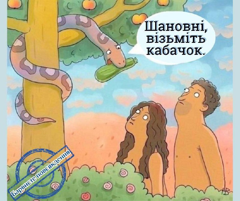 На зображенні нижче — алюзія до біблійної сцени з Адамом і Євою, яких спокушає змій. Але замість яблука спокусою виступає… кабачок. Підпис: "Шановні, візьміть кабачок". Цей мем блискуче ілюструє те, як українці цього літа "спокушають" усіх знайомих щедрими дарами городу. Змій тут — не злодій, а просто сусід, у якого врожай вродив — діліться, бо подіти нікуди.